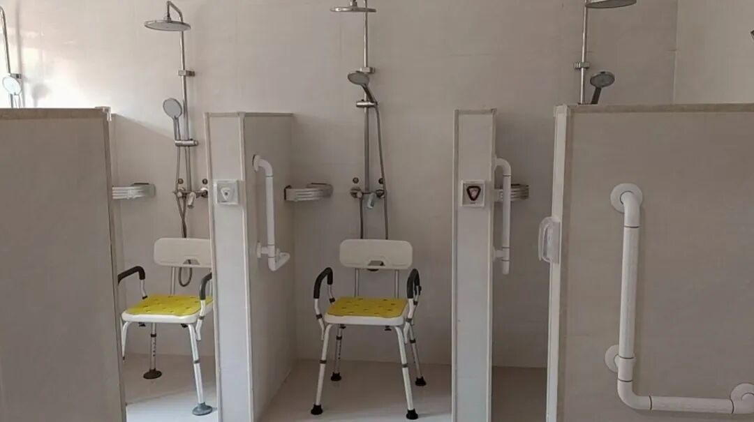 浴室更新:24小时供应热水。浴室换衣间全面更新。洗浴室配备了全新的无障碍椅子、扶手和呼叫器。呼叫器是确保老人在有意外情况的时候可以及时呼叫工作人员。浴室地砖是采用了防滑地砖,进一步的保护老人的洗浴安全。