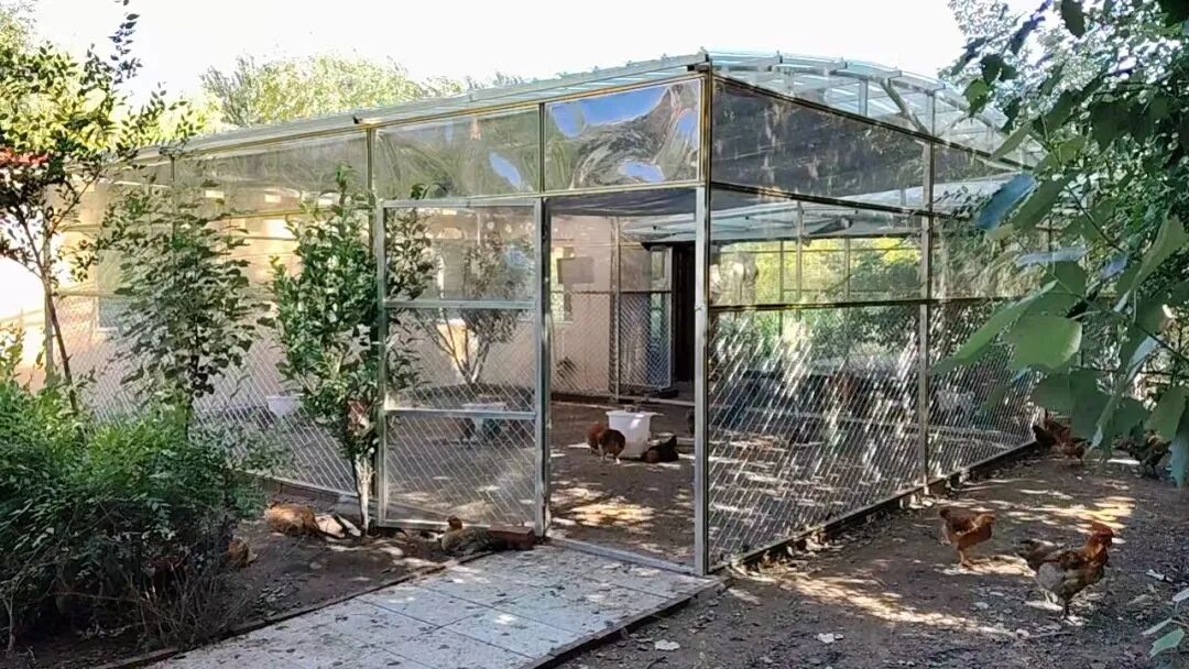 生态鸡棚总览:养老院的生态鸡棚内,阳光透过透明顶棚洒落在踱步的土鸡身上。金属框架围栏外,三五成群的溜达鸡在绿植间自由觅食,远处树木掩映着养老院建筑。这些自养的土鸡每日为长者提供新鲜鸡蛋,让老人餐桌飘散着原生态的醇香。