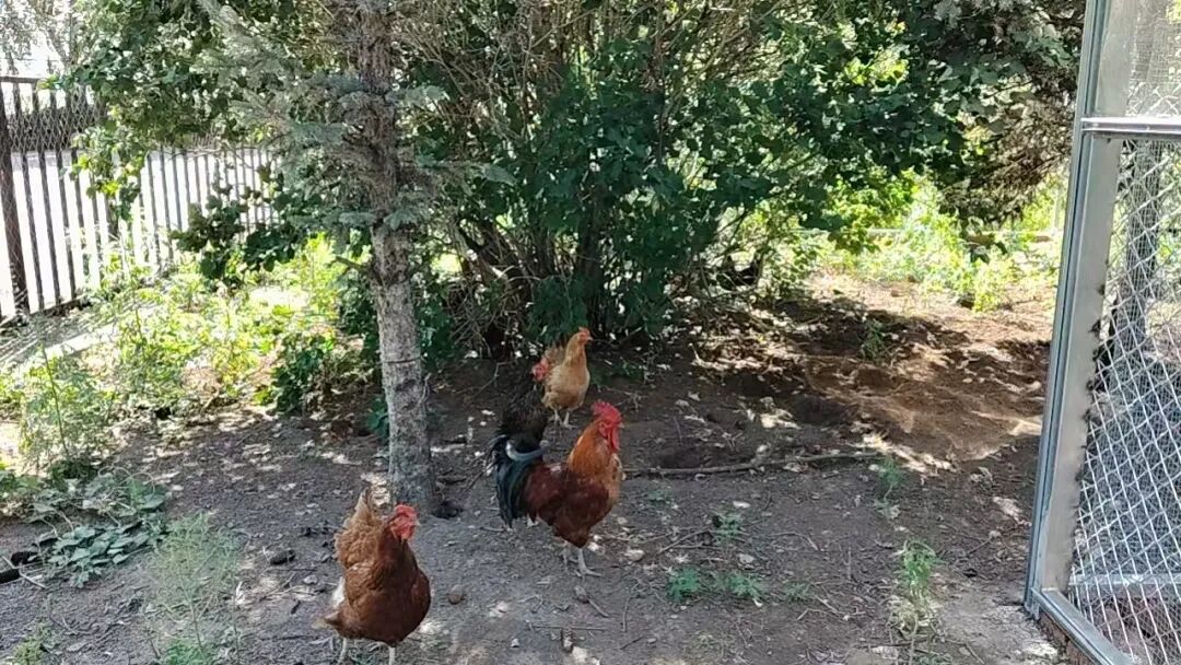 溜达鸡:绿树掩映下,三只溜达鸡正在家好月圆养老院的生态园区悠闲觅食。深色土鸡与浅色母鸡在白色栅栏与金属围栏间自由穿梭,啄食着天然草籽。