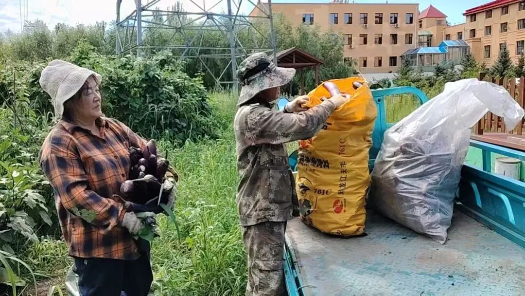 协作画面:阳光下,两位戴遮阳帽的工作人员正将刚采摘的紫茄子装入黄色大袋,蓝色货车旁堆满新鲜蔬菜。绿油油的菜畦映着远处暖色楼宇,人工除草的无公害食材从田间直达老人餐桌,每一筐收获都饱含对长者健康的用心守护。